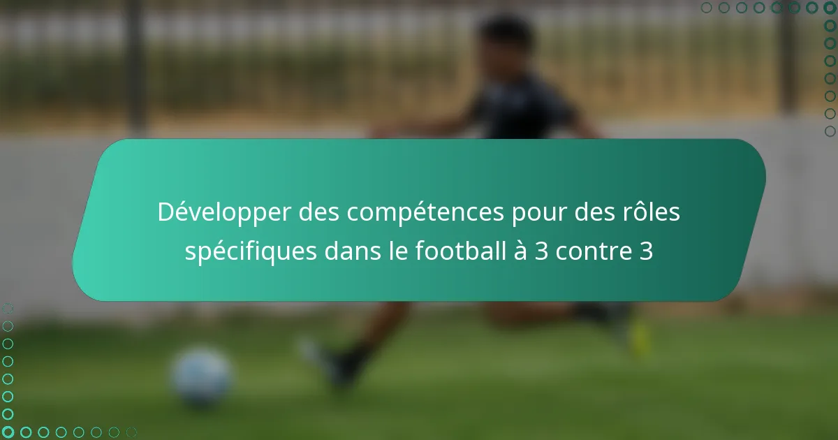 Développer des compétences spécifiques pour chaque rôle dans le football à 3 est crucial pour maximiser la performance de l’équipe. Les défenseurs doivent se concentrer sur le positionnement et la communication, tandis que les milieux de terrain devraient améliorer leur contrôle du ballon et leur intelligence de jeu. Les attaquants doivent affiner leurs techniques de finition et leurs stratégies de mouvement pour contribuer efficacement à la fois à l’attaque et à la défense.